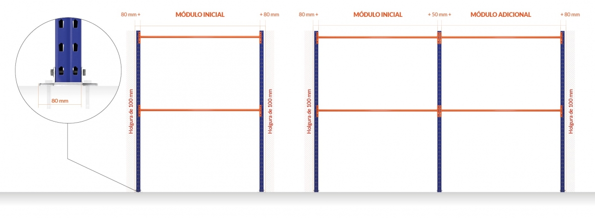 Om de totale lengte van de installatie te berekenen, telt u 160 mm op bij de breedte van het basisrek + 50 mm voor elk extra aanbouwrek die in het rek wordt geplaatst. Als extra veiligheidsmaatregel wordt aanbevolen de verschillende modules aan de vloer te verankeren met de schroeven die bij elk rek worden meegeleverd. Bovendien is het raadzaam een ruimte van 100 mm vrij te laten aan het begin en einde van de rekken.