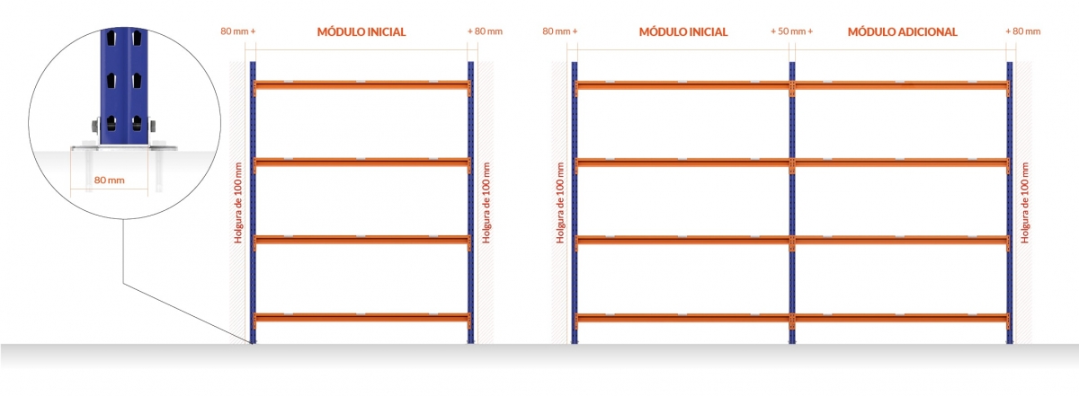Om de totale lengte van de installatie te berekenen, telt u 160 mm op bij de breedte van de beginmodule + 50 mm voor elke extra module die aan het schap wordt toegevoegd. Als extra veiligheidsmaatregel wordt aanbevolen de verschillende modules aan de vloer te verankeren met de schroeven die bij elke plank worden meegeleverd. Bovendien wordt aanbevolen een ruimte van 100 mm vrij te laten aan het begin en het einde van het schap.