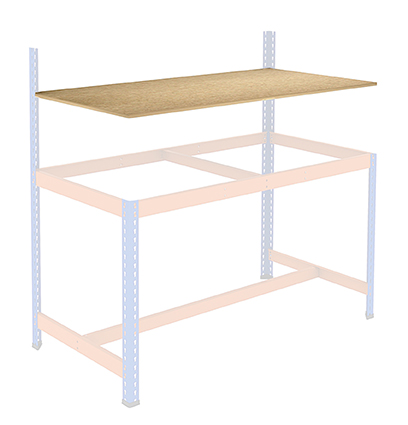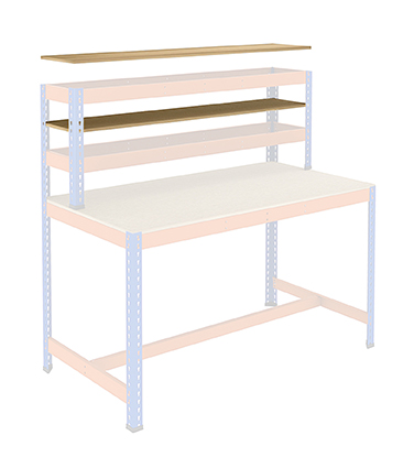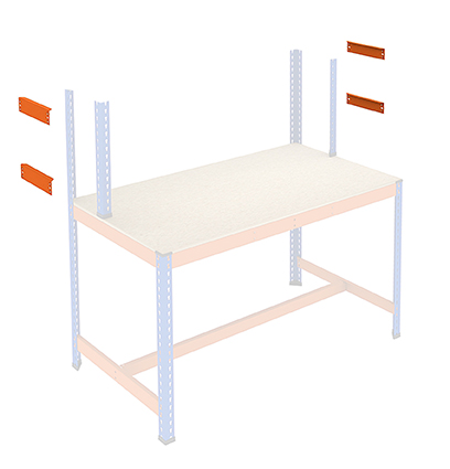 De tafels hebben 1 voetensteun en 2 schappen aan de bovenkant (315 mm diep), gemaakt van 16 mm dik spaanplaat of wit melamine (zonder randen).